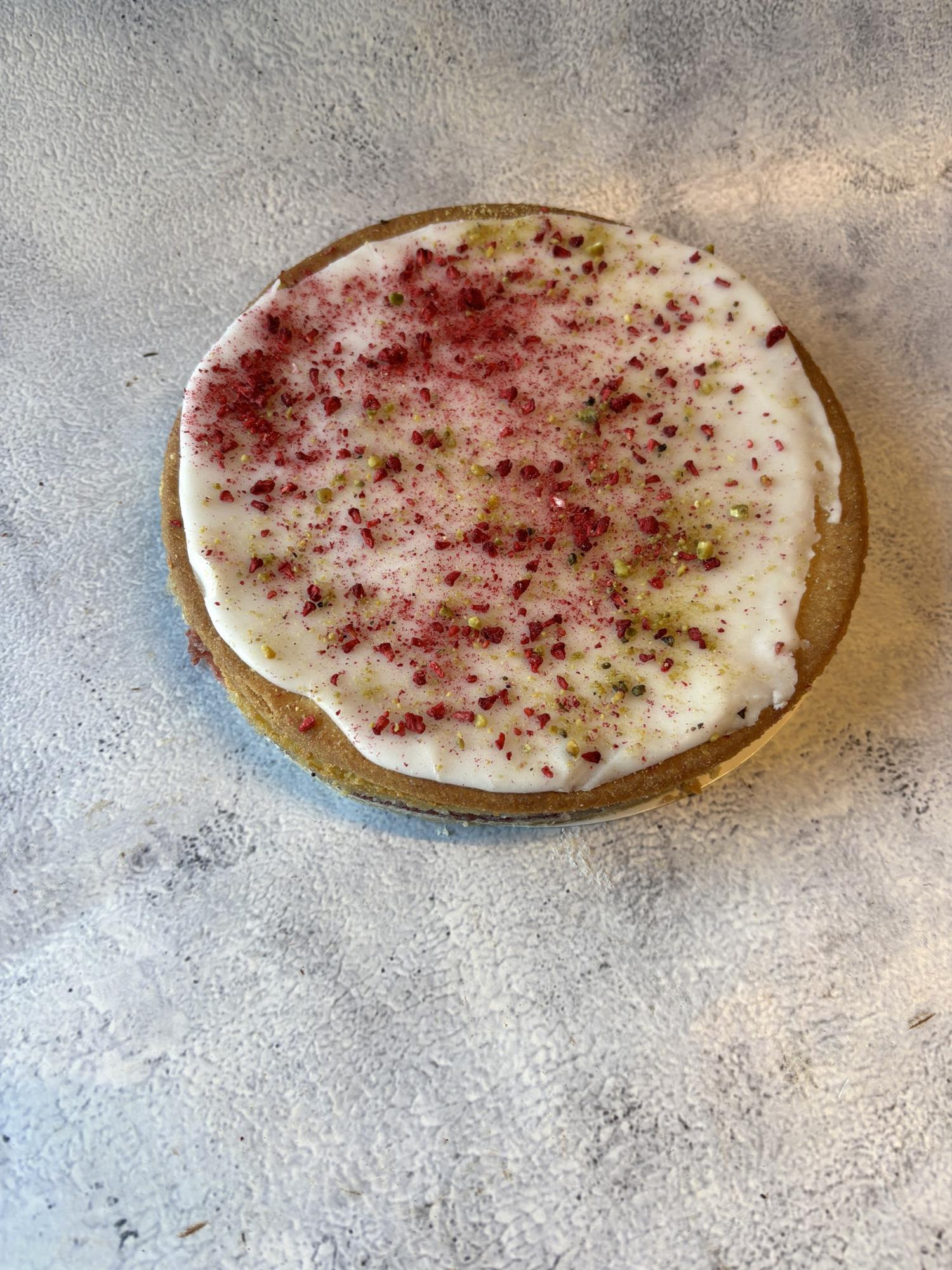 Linsedejsbund, mazarin, hindbærmarmelade og et sprødt linsedejslåg med glasur.