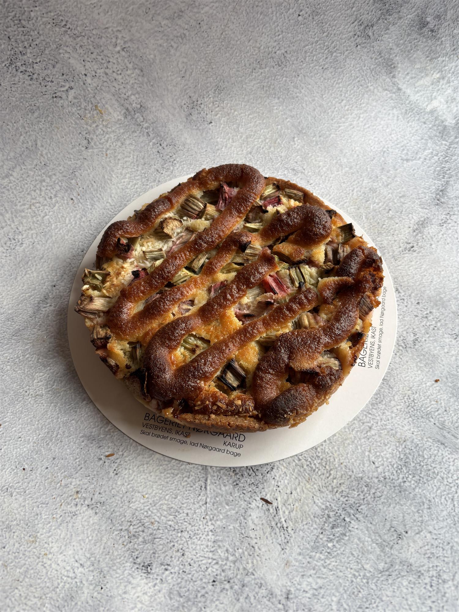 linsedejsbund med kokosmazarinmasse, rabarber og på toppen makronmasse